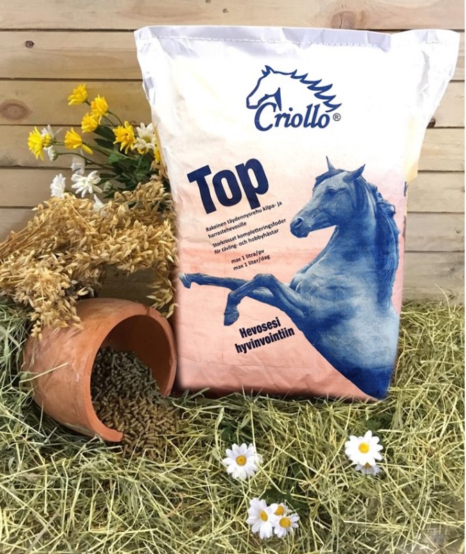 Criollo Top on tarkkaan Suomen olosuhteisiin ja suomalaisen maaperän mukaan suunniteltu kauraton täydennysrehu kilpa- ja harrastehevosille – ensimmäinen Suomen markkinoille tullut rehu, joka sisältää oikeassa suhteessa KAIKKI hevosesi tarvitsemat kivennäiset, hivenaineet, vitamiinit ja aminohapot ja siten, että niitä on riittävästi.